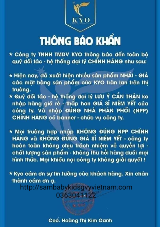 Công ty TNHH TMDV KYO đã thông báo đến toàn bộ quý đối tác và khách hàng, hệ thống CHÍNH HÃNG như sau: